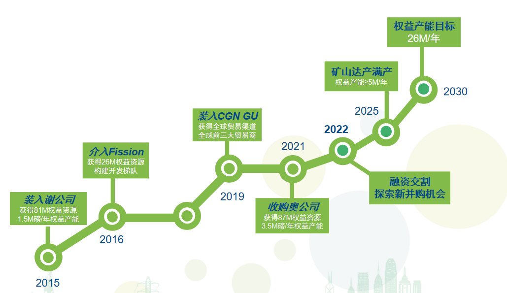 ◇ 2015年,收購哈薩克斯坦謝米茲拜伊鈾公司49%股權(quán),并獲得下轄兩座在運(yùn)鈾礦49%的天然鈾產(chǎn)品包銷權(quán)。中廣核礦業(yè)成為一家主業(yè)清晰的鈾資源開發(fā)和貿(mào)易公司。 ◇ 2016年,收購加拿大上市公司Fission Uranium Corp 19.99%股權(quán),并獲得20%的天然鈾產(chǎn)品包銷權(quán)及額外的15%的包銷選擇權(quán)。中廣核礦業(yè)成功介入加拿大高品位鈾礦項(xiàng)目,成為Fission公司單一最大股東。 ◇ 2016年,中廣核礦業(yè)與哈薩克原子能工業(yè)股份有限公司簽署《鈾礦原則協(xié)議》及其補(bǔ)充協(xié)議,約定雙方就總資源量達(dá)4萬噸鈾的鈾礦山開展合作,其中公司未來總包銷量將不低于2萬噸鈾。 ◇ 2016年,復(fù)星集團(tuán)認(rèn)購中廣核礦業(yè)9.99%股權(quán)。 ◇ 2019年,中廣核礦業(yè)完成對(duì)中廣核國(guó)際鈾產(chǎn)品銷售有限公司100%股權(quán)的收購。 ◇ 2021年,收購哈薩克斯坦奧爾塔雷克公司49%股權(quán),并獲得下轄兩座在運(yùn)鈾礦49%的天然鈾產(chǎn)品包銷權(quán)。 ◇ 2022年,中廣核礦業(yè)引入混改基金為首11家投資人完成交割。